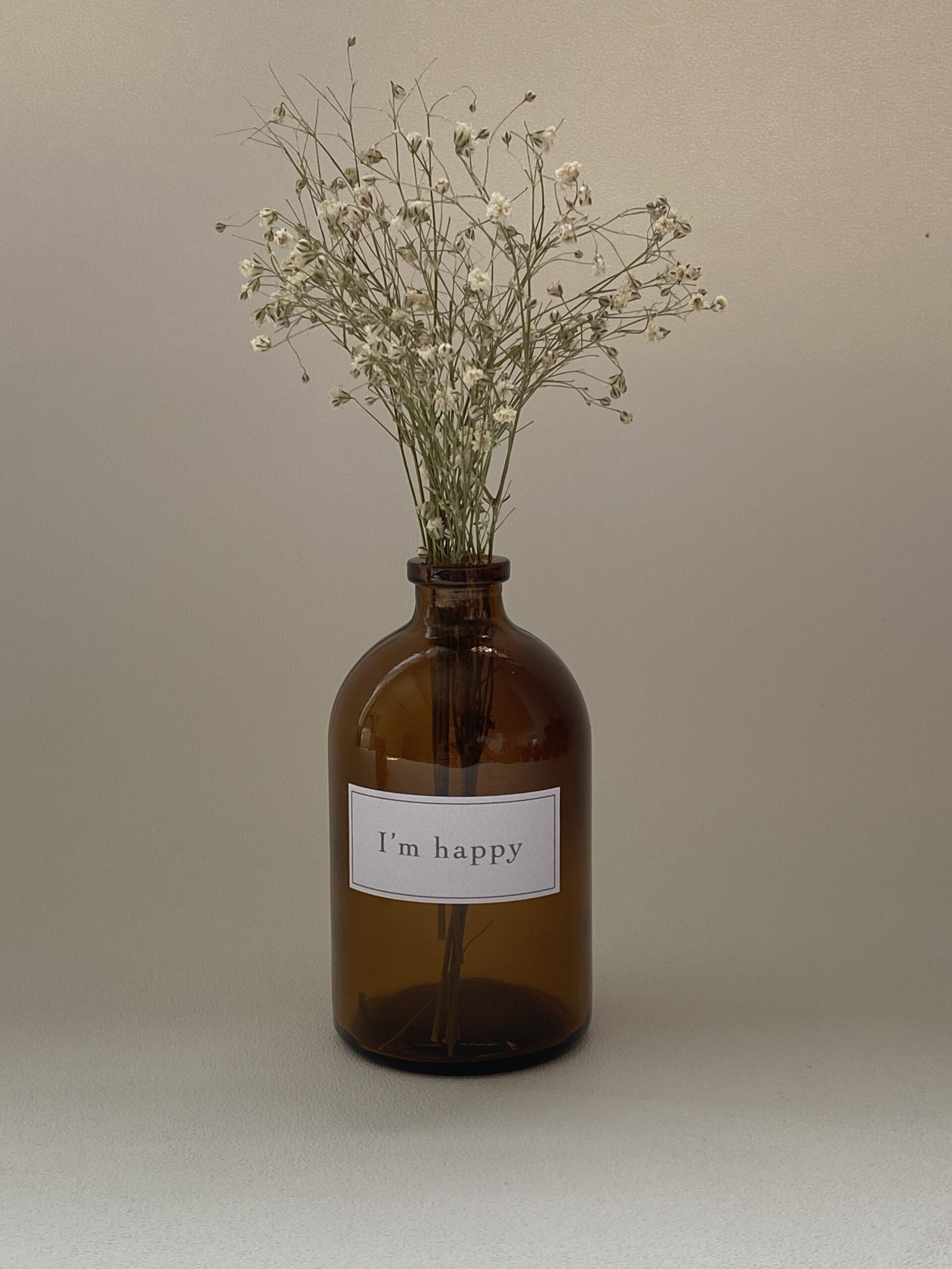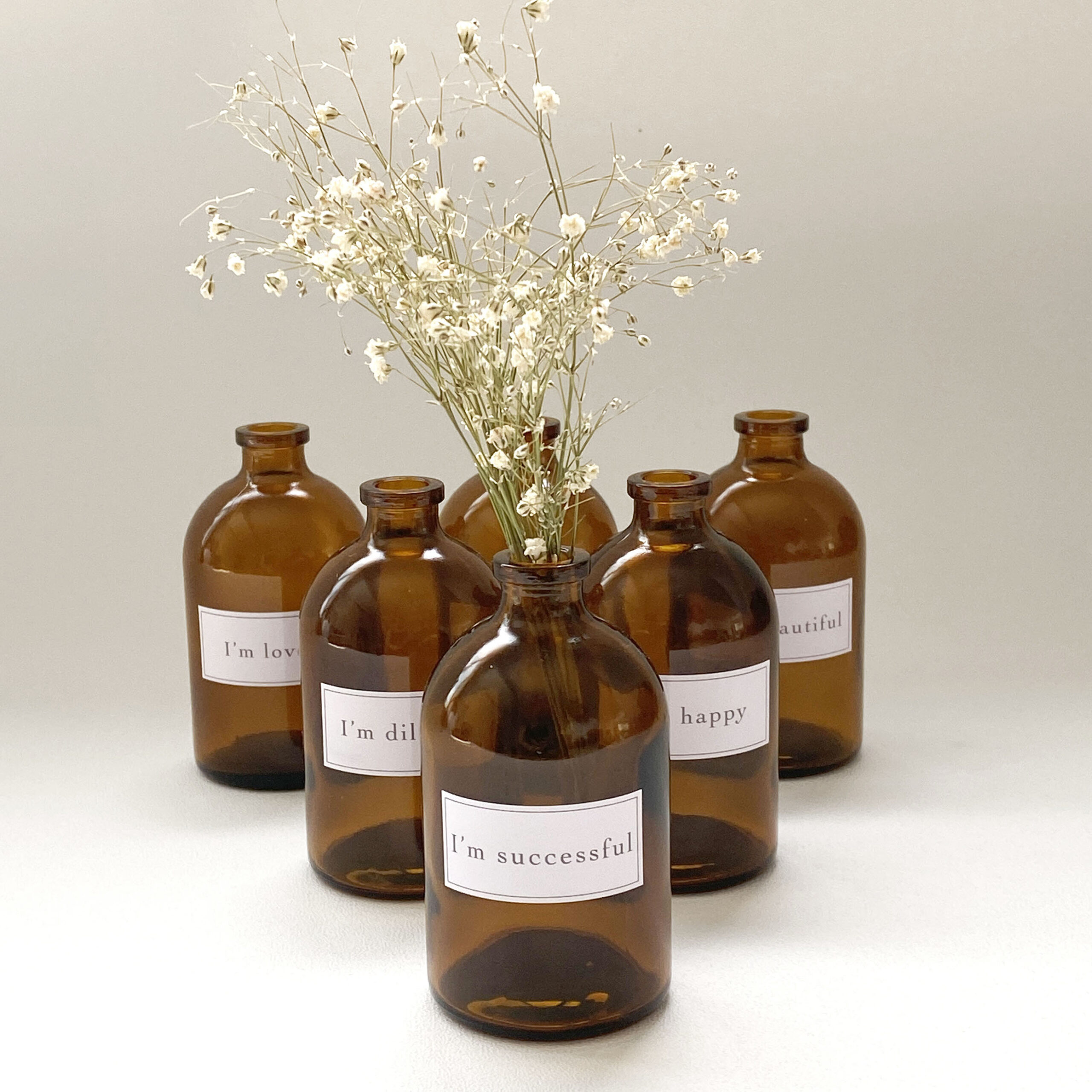 הבקבוקים מגיעים בעיצוב עדין, הכולל זר גיבסניות מיובש, ומילה חיובית על עצמכם לפי בחירה.